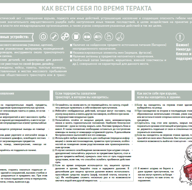 Знание о терроризме, как наиболее опасном преступном явлении сегодняшнего дня, умение правильно вести себя при его угрозе и для его предупреждения дают возможность защитить себя и окружающих от последствий теракта.