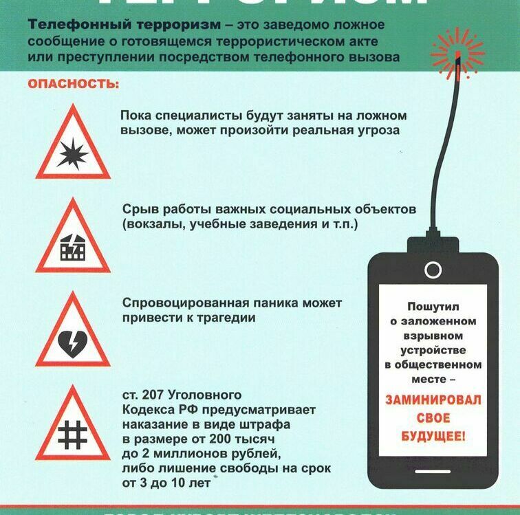 Известно много случаев, когда даются заведомо ложные сообщения о якобы готовящихся терактах. Иногда к таким «шуткам» прибегают учащиеся, обычно желая сорвать контрольную работу. Уголовный кодекс предусматривает за такие преступления наказание в виде штрафа до 200 тыс. рублей, либо исправительных работ сроком от одного года до двух лет, либо лишения свободы на срок до трех лет. Если такое преступное деяние совершают дети, не достигшие возраста уголовной ответственности, то всю материальную ответственность за них несут родители.