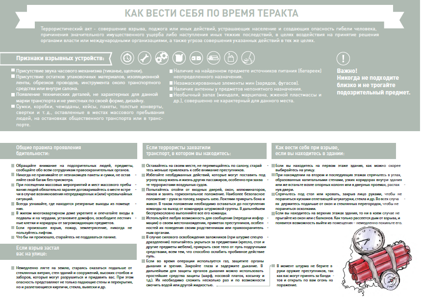 Не предпринимать самостоятельно никаких действий с предметами, похожими на взрывное устройство – это может привести к их взрыву, многочисленным жертвам и разрушениям!